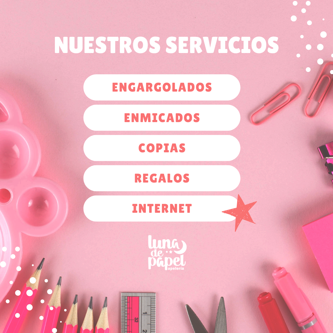Bienvenido a Luna de Papel, tu destino completo para todas tus necesidades depapelería y más! En nuestro acogedor espacio, ofrecemos una amplia gama deservicios, desde copias y engargolados hasta forrado de cuadernos y regalospersonalizados.